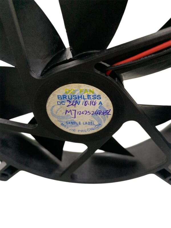 The fan uses a brushless DC motor, which provides quiet operation, longer service life, and improved efficiency compared with traditional brushed motors. It operates on 24 V DC power and draws approximately 0.14 A, making it energy-efficient while still providing steady airflow.