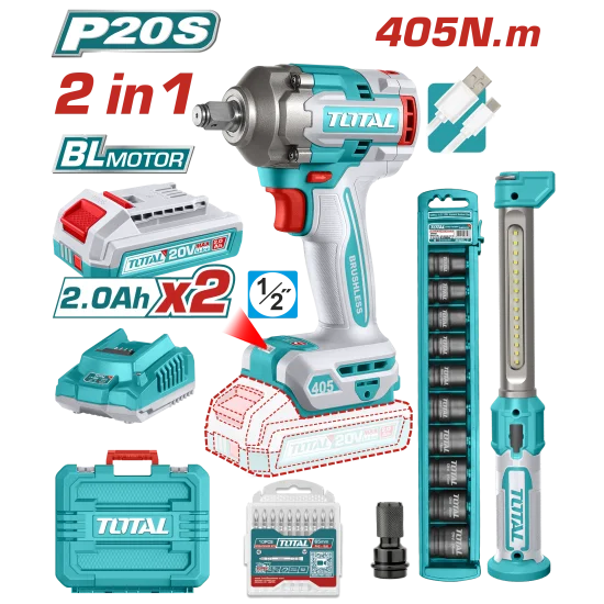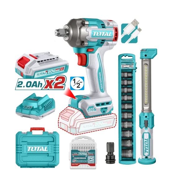 Tool Kit, Combo, 2-in-1, Impact Wrench + Work Lamp, 2pc 2A batteries + Charger, Total