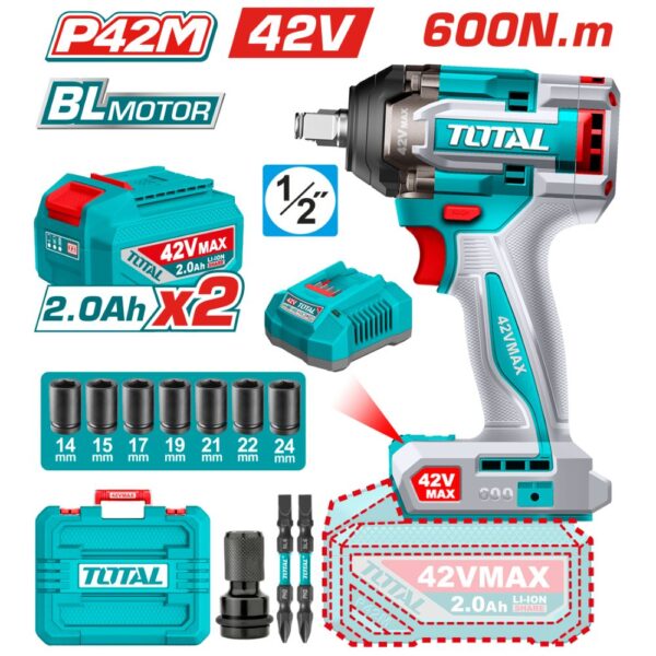 Wrench, Impact, Cordless, 42v, ½”, 600Nm, 2pc 2A Batteries, Total